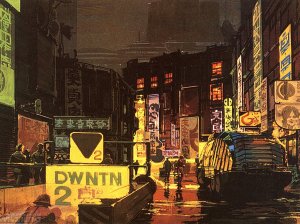 Bladerunner is a marvelous interpretation of the future-as-dystopia: a multi-tribal city looking like a cross between Tokyo, Hongkong, and that part of Woodside, Queens, below the elevated line. Its citizens are reminiscent of Casablanca‘s: generally harmless persons of ill repute waiting for their first opportunity to jump ship and go somewhere better. The other-worldiness of ziggurats, flying cars, and large neon signs are mixed in comfortably with the this-worldliness of newspapers, asian-style noodle soup, video pay phones, and that most timeless of things, Love.